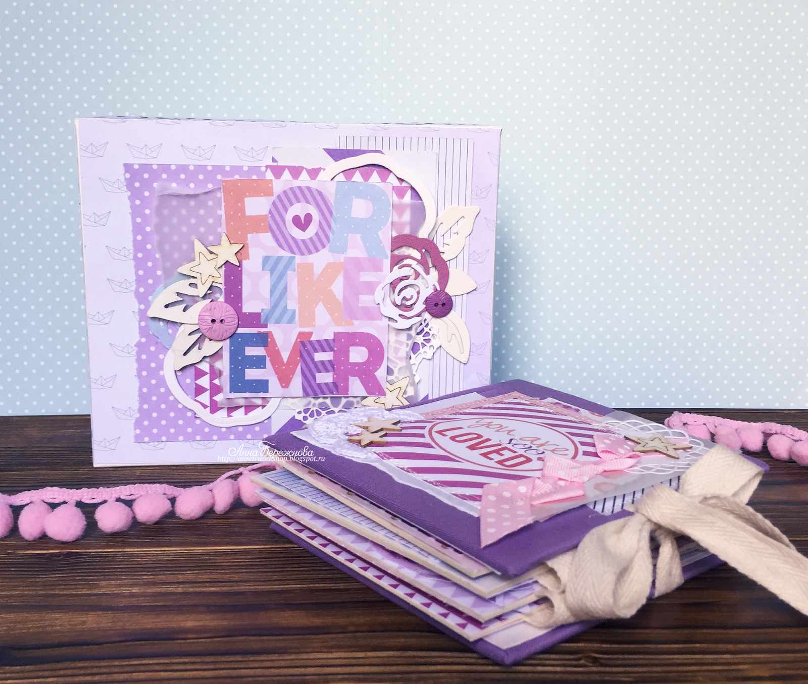Этот розово-лиловый миник сделан из великолепной бумаги Studio Texturek "Hei kiddo", она прекрасно оттенила отпускные фото нашей подружки Кати. Бумага просто отличная: плотная, прекрасно выдерживает биговку, красиво рвется... И принты такие милые!