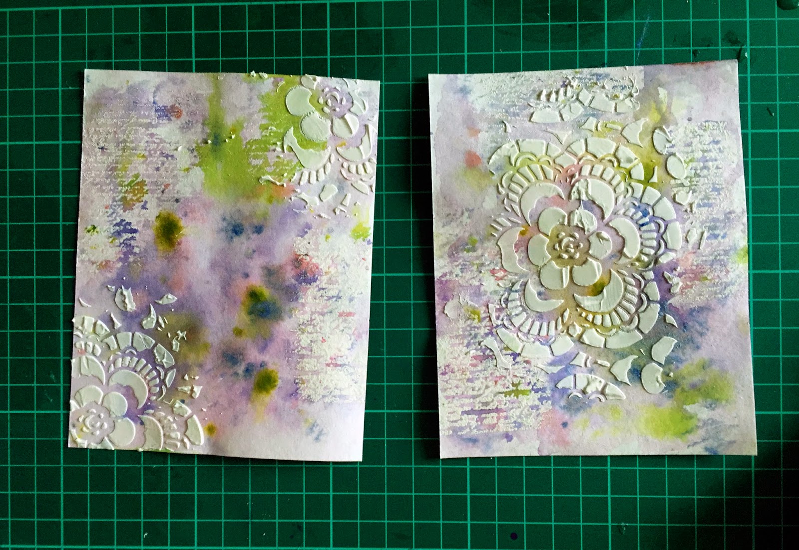 На наших заготовках появляется резист-эффект: оттиски наших фоновых штампов как будто проявляются на фоне цветовых пятен.